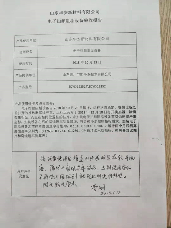 山東華安新材料有限公司掃頻除垢儀使用效果