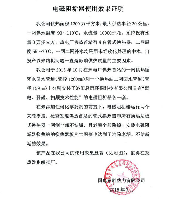 國(guó)電東勝熱力公司為解決供熱首站管式換熱器和換熱站內(nèi)板式換熱機(jī)組板片結(jié)垢問題,在2013年訂購(gòu)了兩套輕雨環(huán)保掃頻電子除垢儀。