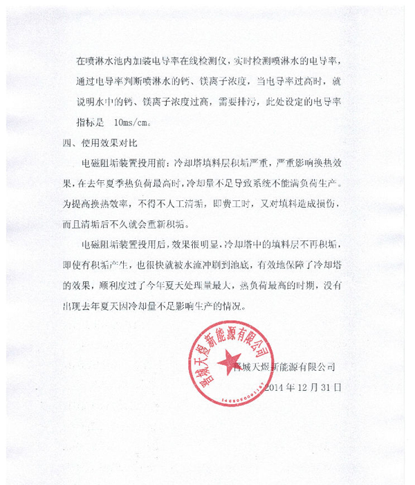 天煜新能源廠區(qū)2013年12月在蒸發(fā)式冷卻器上安裝一套輕雨環(huán)保掃頻電子除垢儀后,因冷卻量不足而影響廠區(qū)生產(chǎn)的現(xiàn)象也不再發(fā)生。