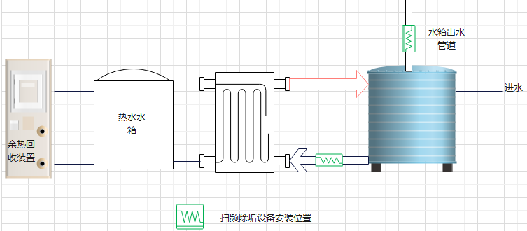 掃頻除垢裝置安裝完成后,可以保護(hù)板換冷水側(cè)不結(jié)垢,153m³集水箱不結(jié)垢,整個系統(tǒng)管道不結(jié)垢,末端用水裝置不結(jié)垢。設(shè)計示意圖如下: